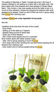 I met with Ron and we looked through some of the other olive and food videos to brain storm. We couldn’t figure out any ideas, but I managed to find some inspiration after seeing an olive skewer. The video would have the theme that olives are a key part of the party that you can bring with you anywhere. We ended up filming a green screen segment the next day with Ron. The plan was to film the main shoot at the Celebration Canada event as I thought it would create more of a festive North American feel in Taipei.